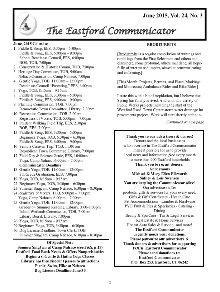 June 2015, Vol. 24, No. 3The East ford Communicator June 2015 Calendar 1 Fiddle & Song, YES, 3:30pm 5:00pm Fiddle & Song, YES, 6:00pm 9:00pm School Readiness Council, YES, 6:00pm BOS, TOB, 7:00pm
