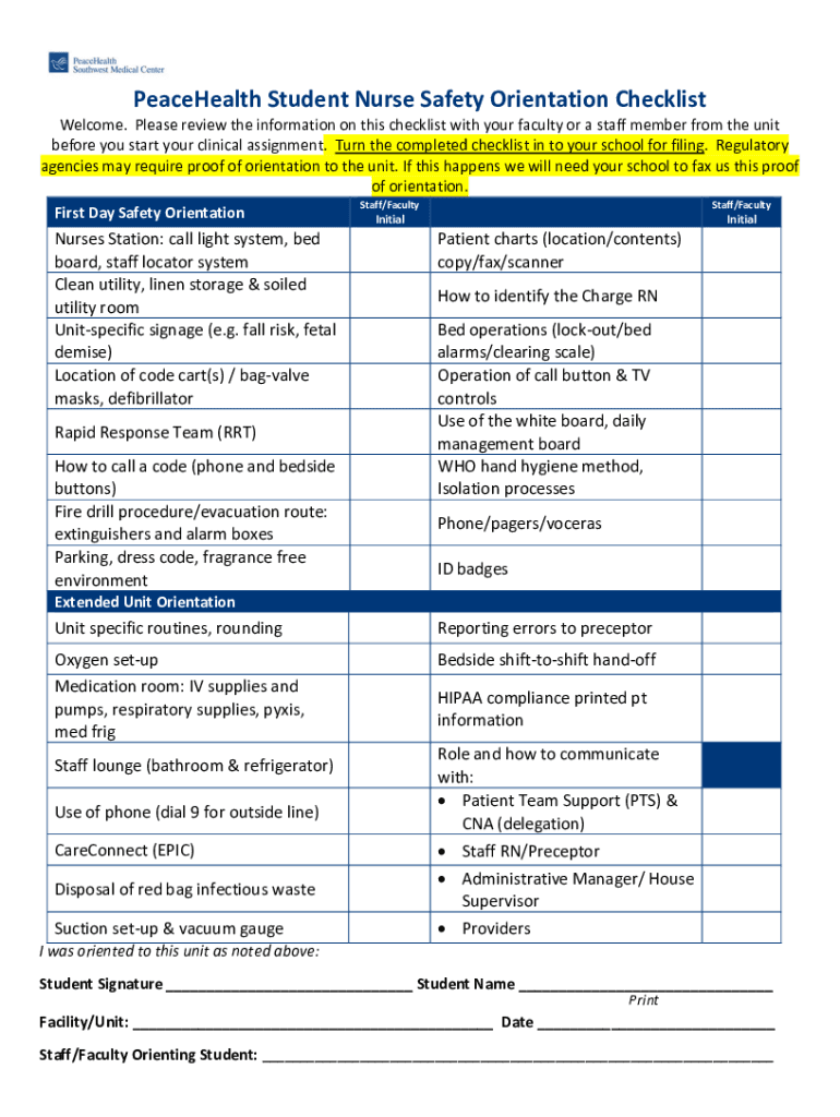 Telehealth Student Nurse Safety Orientation Checklist Welcome. Please review the information on this checklist with your faculty or a staff member from the unit before you start your clinical assignment.