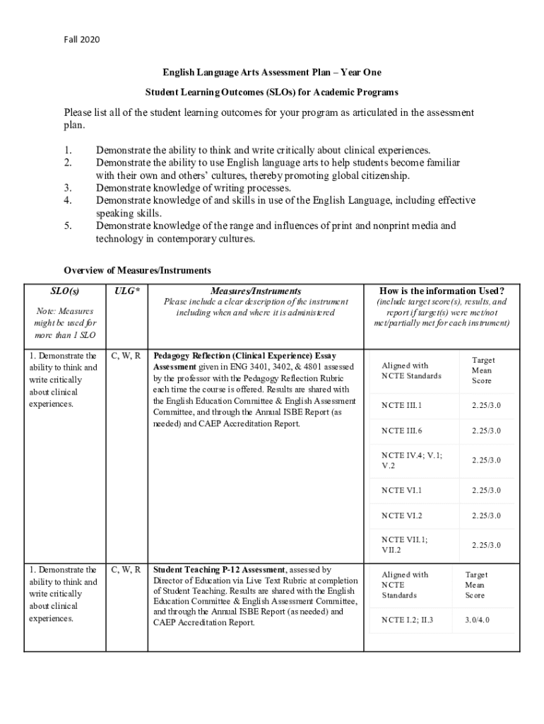 Fall 2020 English Language Arts Assessment Plan Year One Student Learning Outcomes (Los) for Academic ProgramsPlease list all the student learning outcomes for your program as articulated in the assessment