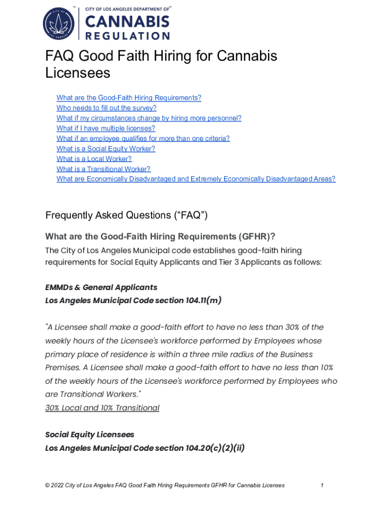 FAQ Good Faith Hiring for Cannabis Licensees What are the Good Faith Hiring Requirements? Who needs to fill out the survey? What if my circumstances change by hiring more personnel? What if I have
