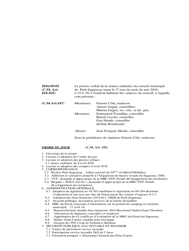 Obtenir le gratuit 2016:05:02 Le procs-verbal de la sance ordinaire du ...