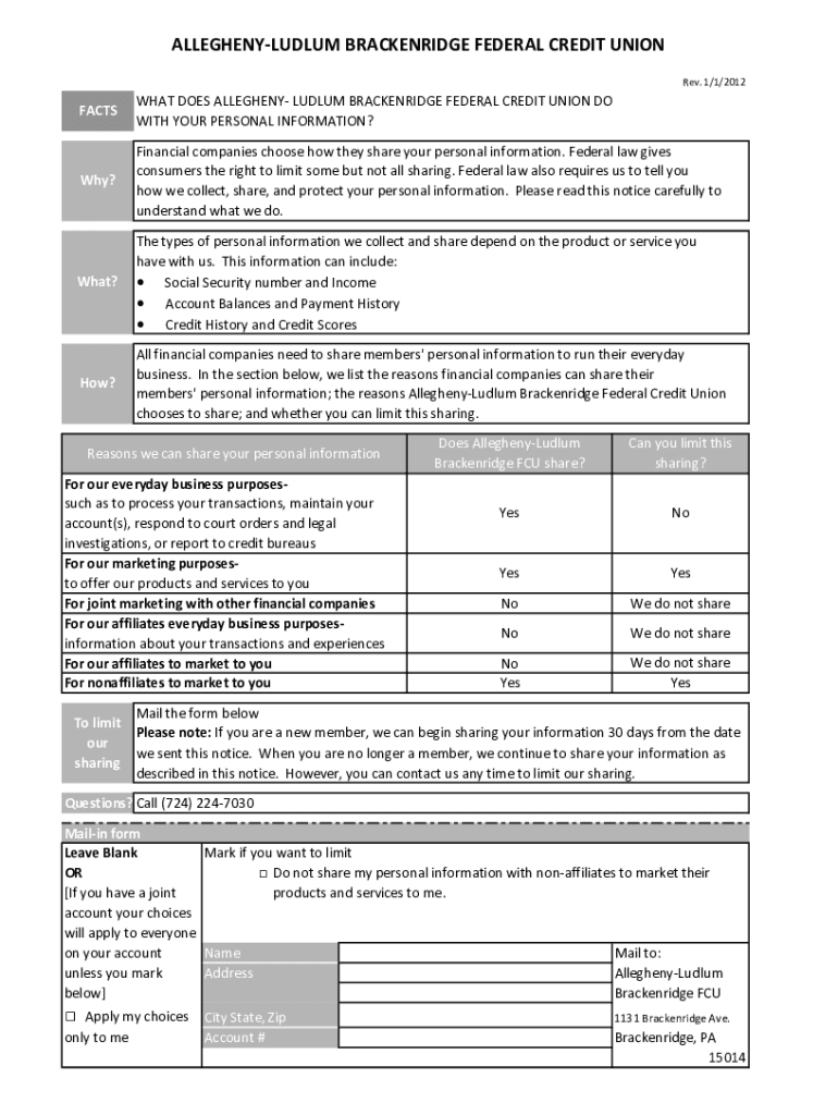 ALLEGHENYLUDLUM BRECKENRIDGE FEDERAL CREDIT UNION Rev. 1/1/2012FACTSWHAT DOES ALLEGHENY LULU BRECKENRIDGE FEDERAL CREDIT UNION DO WITH YOUR PERSONAL INFORMATION? Why? Financial companies choose how