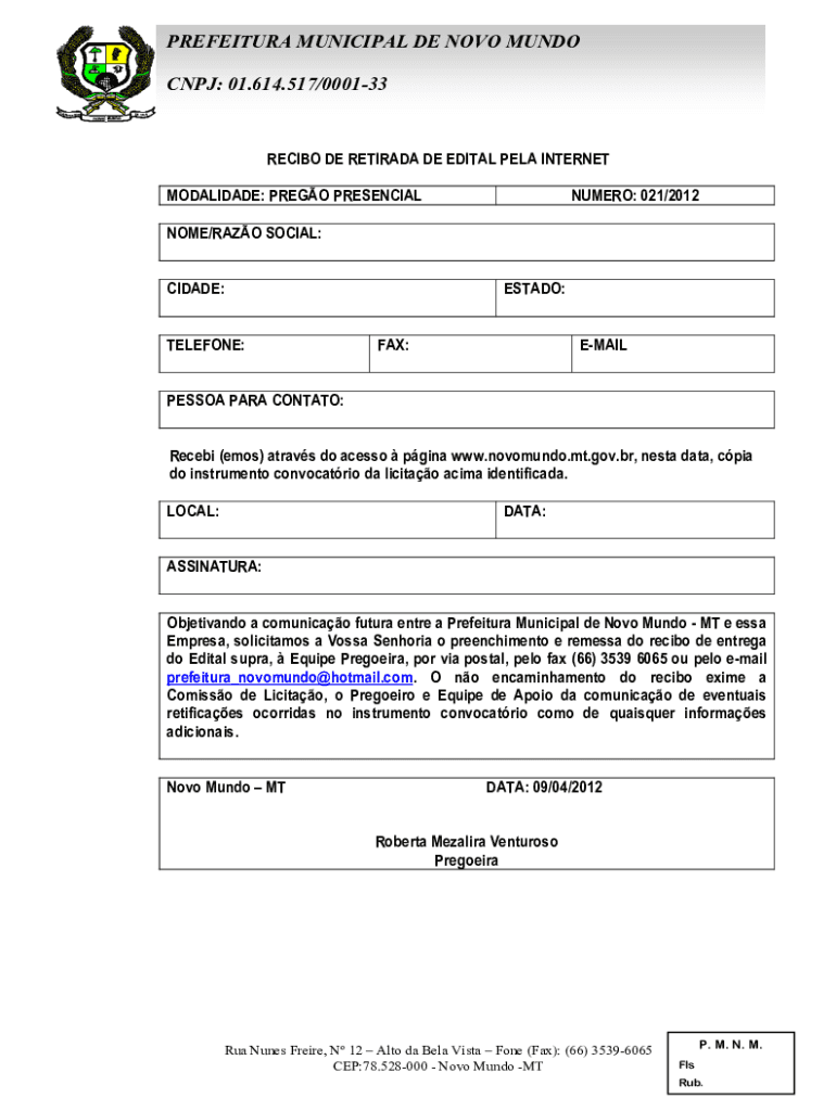 MODALIDADE: PRESO PRESENCIALNUMERO: 021/2012NOME/RAZOR SOCIAL:MIDADE:TELEPHONE:ESTATE:FAX:EMAILPESSOA