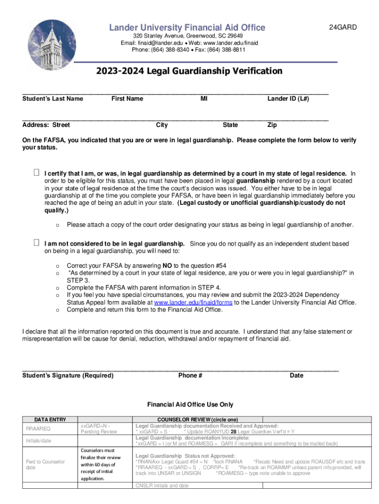 Lander University Financial Aid Office24GARD320 Stanley Avenue, Greenwood, SC 29649 Email: finaid@lander.edu Web: www.lander.edu/finaid Phone: (864) 3888340 Fax: (864) 388881120232024 Legal Guardianship