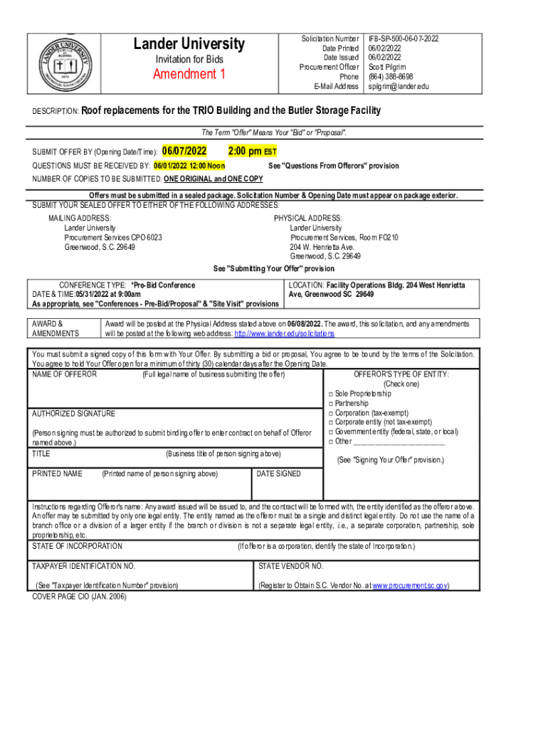 Lander UniversitySolicitation Number Date Printed Date Issued Procurement Officer Phone Email AddressInvitation for BidsAmendment 1 DESCRIPTION: RoofIFBSP50006072022 06/02/2022 06/02/2022 Scott Pilgrim