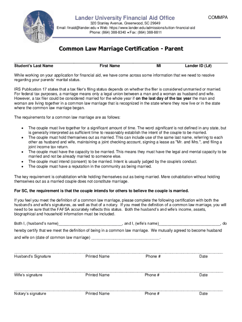 Couples who have been living together and holding themselves out as married without a formal license are required to file for common law marriage certification.