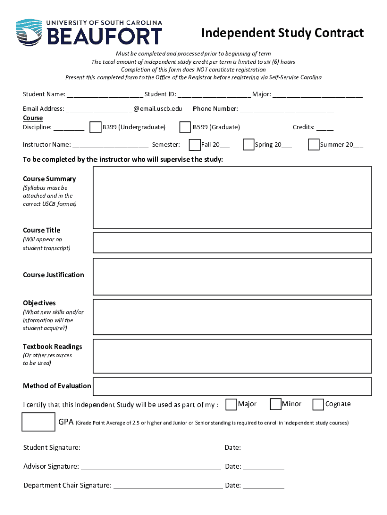 Independent Study Contract Must be completed and processed prior to beginning of term The total amount of independent study credit per term is limited to six (6) hours Completion of this form does