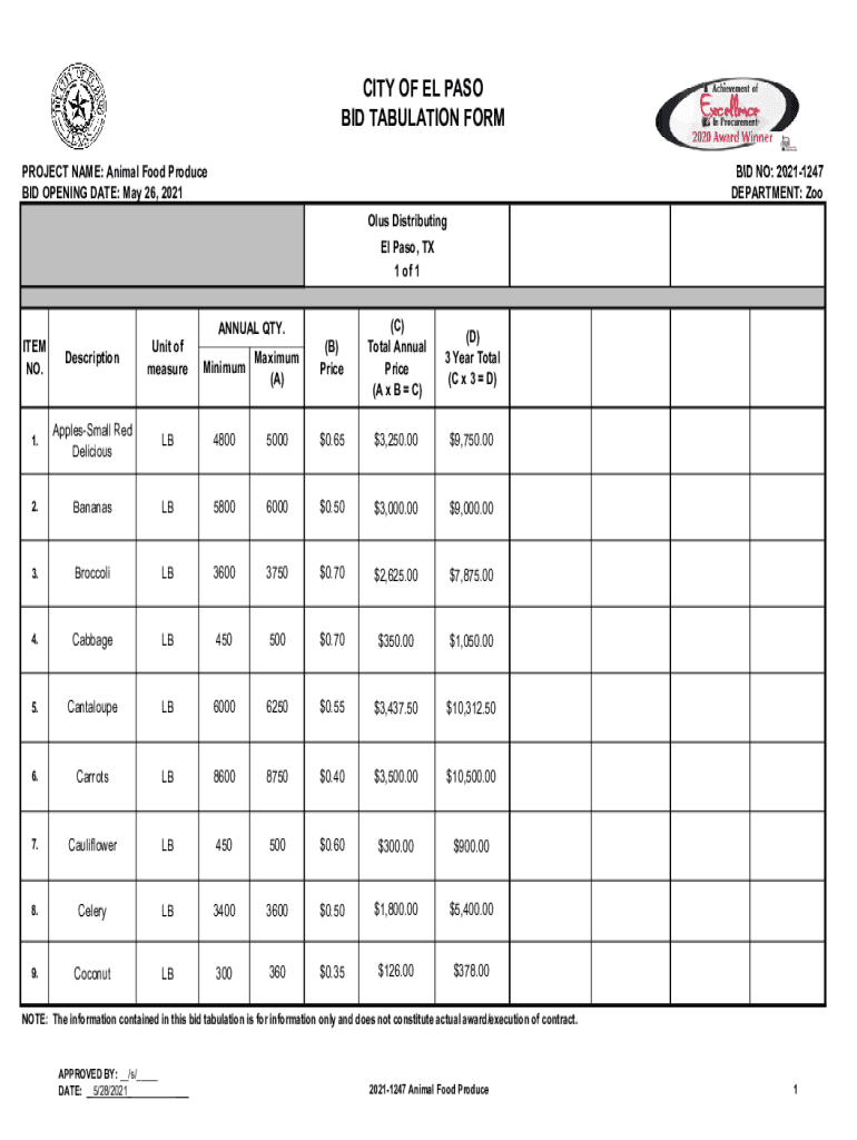 Get the free CITY OF EL PASO BID TABULATION FORM (REVISED)