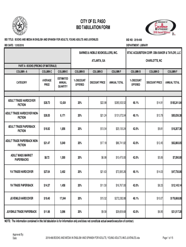 BID TITLE: BOOKS AND MEDIA IN ENGLISH AND SPANISH FOR ADULTS, YOUNG ADULTS AND JUVENILES BID NO: 2019466BID DATE: 12/05/2018DEPARTMENT: LIBRARYBARNES & NOBLE BOOKSELLERS,