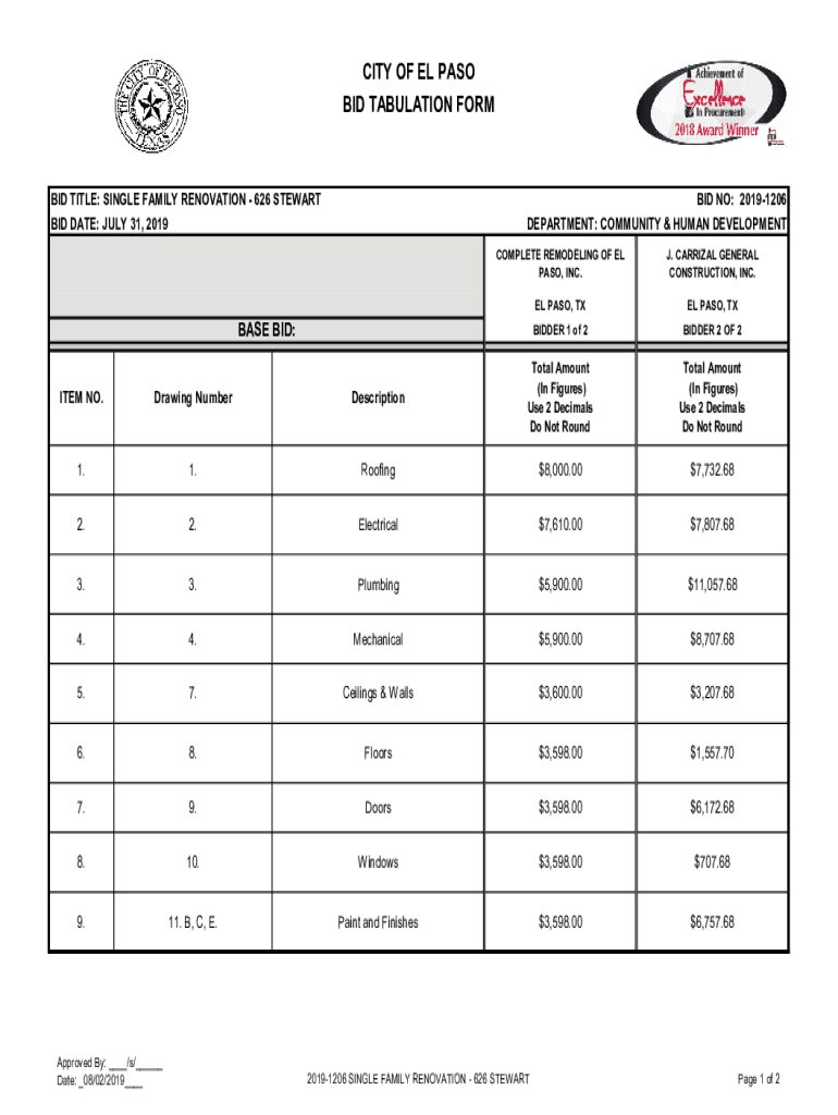 CITY OF EL PASO BID TABULATION FORBID TITLE: SINGLE FAMILY RENOVATION 626 STEWART BID DATE: JULY 31, 2019BID NO: 20191206 DEPARTMENT: COMMUNITY & HUMAN DEVELOPMENT COMPLETE REMODELING OF EL PASO,