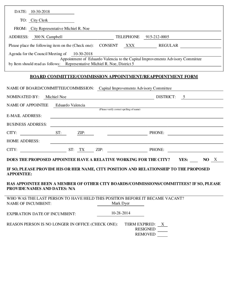 DATE: 10302018 TO: City Clerk FROM: City Representative Michael R. Noe ADDRESS:300 N. CampbellTELEPHONEPlease place the following item on the (Check one):CONSENT9152120005XXXREGULARAgenda for the
