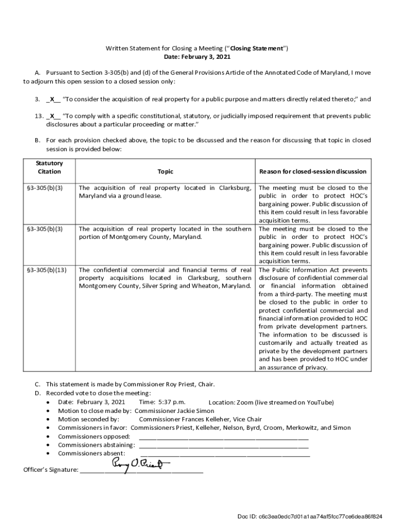 Written Statement for Closing a Meeting (Closing Statement) Date: February 3, 2021, A. Pursuant to Section 3305(b) and (d) of the General Provisions Article of the Annotated Code of Maryland, I move