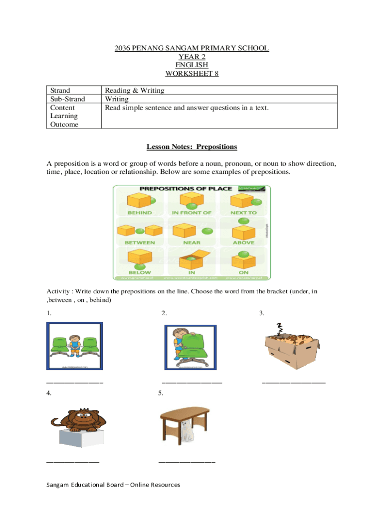 2036 PEN ANG SAN GAM PRIMARY SCHOOL YEAR 2 ENGLISH WORKSHEET 8 Strand Substrate Content Learning Outcome Reading & Writing Read simple sentence and answer questions in a text. Lesson Notes: Prepositions