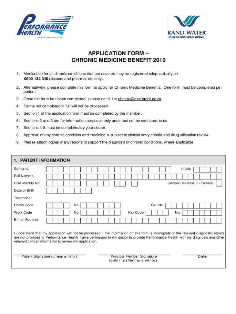 APPLICATION FORM CHRONIC MEDICINE BENEFIT 2019 1. Medication for all chronic conditions that are covered may be registered telephonically on 0800 132 345 (doctors and pharmacists only). 2. Alternatively,