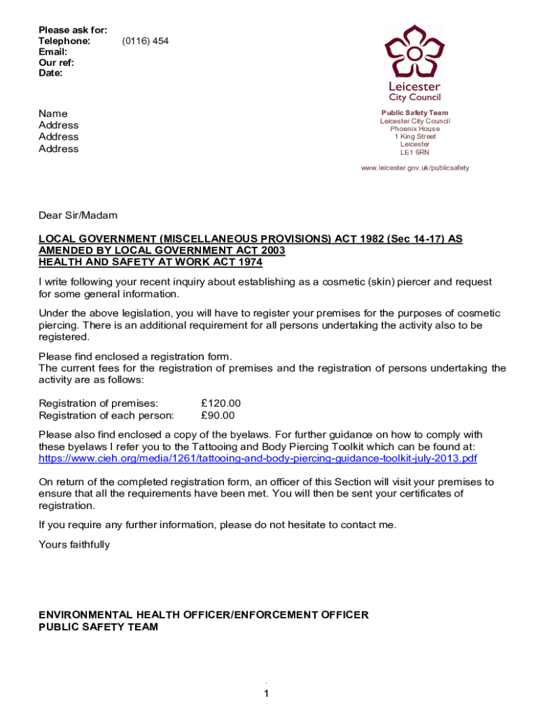 To fill out the body piercing registration form, establishments must provide information about their business, contact details, and compliance with health and safety regulations.