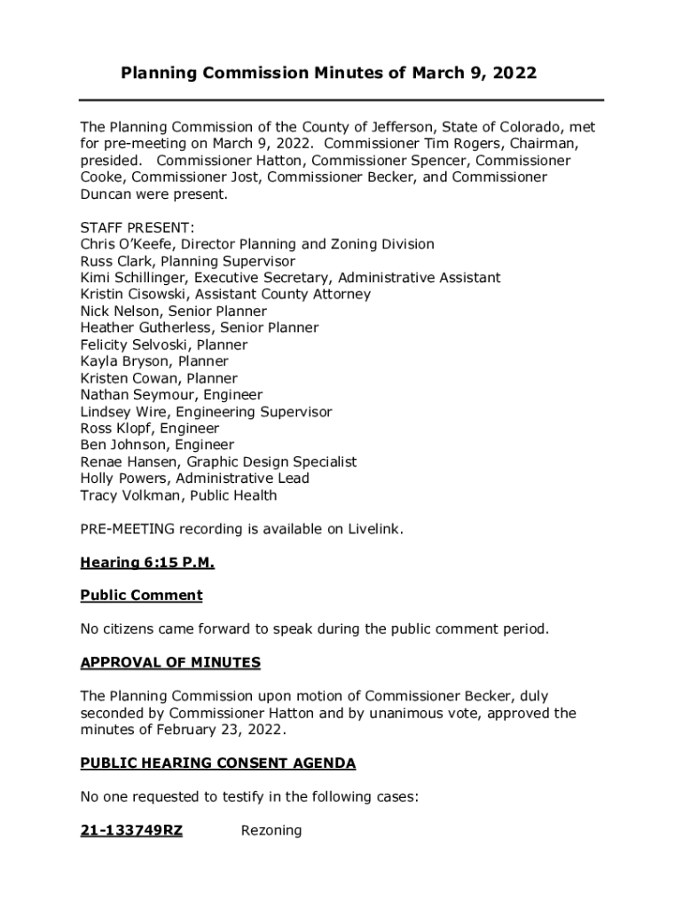 Planning Commission Minutes of March 9, 2022, The Planning Commission of the County of Jefferson, State of Colorado, met for presenting on March 9, 2022. Commissioner Tim Rogers, Chairman, presided.