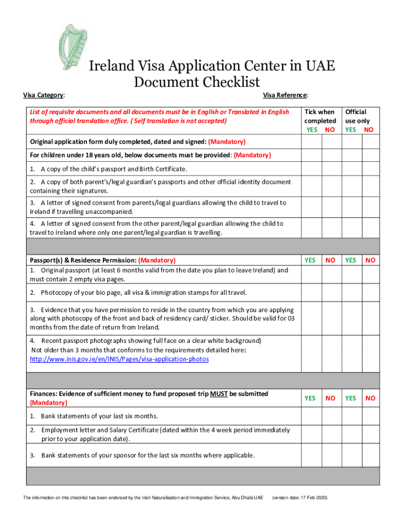 Ireland Visa Application Center in the UAE Document Checklist Visa Category:Visa Reference:List of requisite documents and all documents must be in English or Translated in English through official