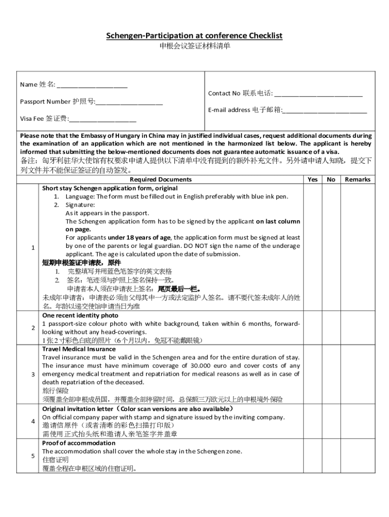 SchengenParticipation at conference Checklist Name : ___ Contact No : ___ Passport Number :___ Email address :___ Visa Fee :___ Please note that the Embassy of Hungary in China may in justified individual