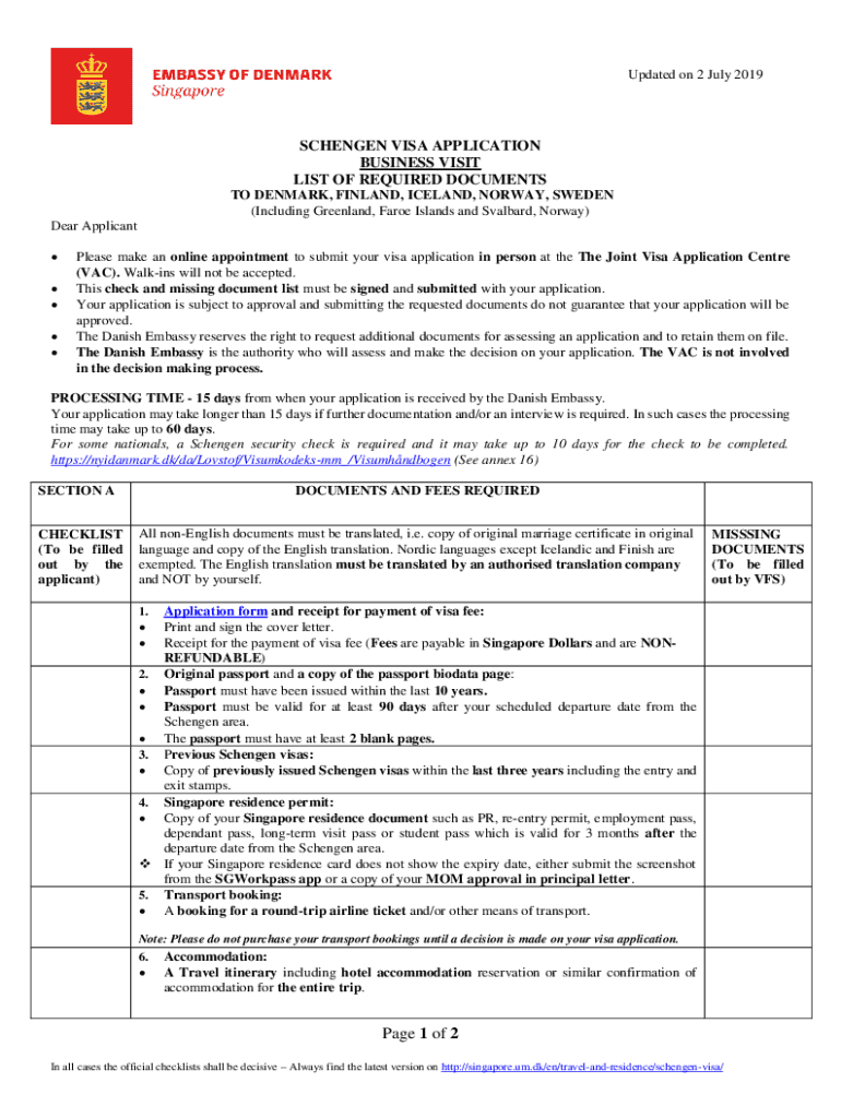 Updated on 2 July 2019SCHENGEN VISA APPLICATION BUSINESS VISIT LIST OF REQUIRED DOCUMENTS TO DENMARK, FINLAND, ICELAND, NORWAY, SWEDEN (Including Greenland, Fare Islands and Svalbard, Norway) Dear