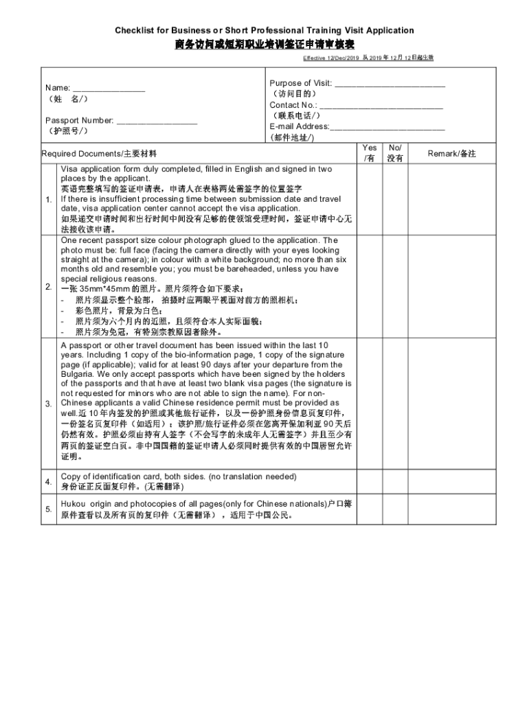 Checklist for Business or Short Professional Training Visit Application Effective 12/Dec/2019 2019 12 12 Purpose of Visit: ___ Contact No.: ___ / Passport Number: ___ Email Address: ___ / (/) Yes