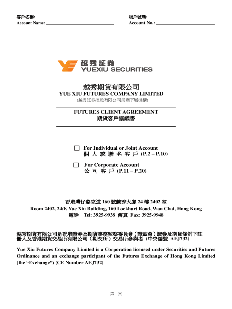 Account Name: ___Account No.: ___ DUE AIU FUTURES COMPANY LIMITED ()___FUTURES CLIENT AGREEMENT ___ For Individual or Joint Account (P.2 P.10) For Corporate Account (P.11 P.20) 160 24 2402 Room 2402,