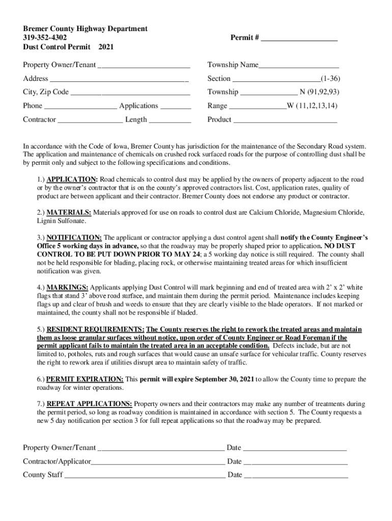Bremen County Highway Department 3193524302 Dust Control Permit 2021Permit # ___Property Owner/Tenant ___Township Name___Address ___Section ___(136)City, Zip Code ___Township ___ N (91,92,93)Phone