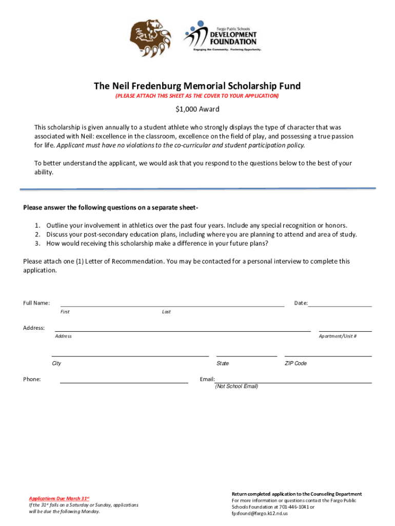 Applicants must report their personal information, academic achievements, financial situation, and any other relevant details required by the scholarship committee on Neil Fredenburg Memorial Scholarship application.