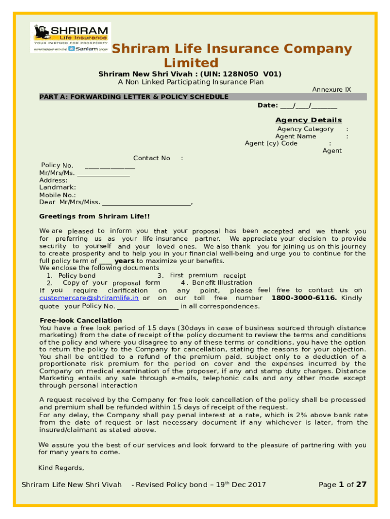 Sriram Life Insurance Company Limited Sriram New Sari Viva : (IN: 128N050 V01) A Non-Linked Participating Insurance Plan Appendix IX PART A: FORWARDING LETTER & POLICY SCHEDULE Date: ___/___/___ Agency