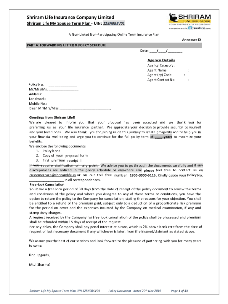 Sriram Life Insurance Company Limited Sriram Life My Spouse Term Plan IN: 128N085V01 A Unlinked Nonparticipating Online Term Insurance Plan Appendix IX PART A: FORWARDING LETTER & POLICY SCHEDULE