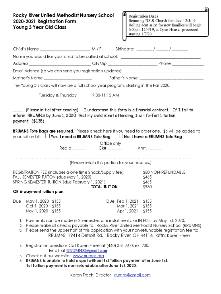 Rocky River United Methodist Nursery School 20202021 Registration Form Young 3-Year-Old Classifieds Name ___ M / Registration Dates Returning NS & Church families: 12/5/19 Rolling admission for new