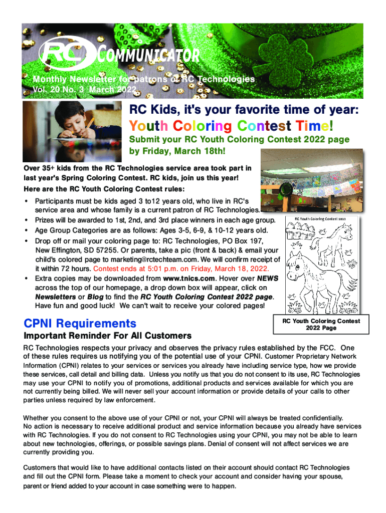 Communicator Monthly Newsletter for patrons of RC Technologies colonies Vol. 20 No. 3 March 2022RC Kids, it\'s your favorite time of year:Youth Coloring Contest Time! Submit your RC Youth Coloring