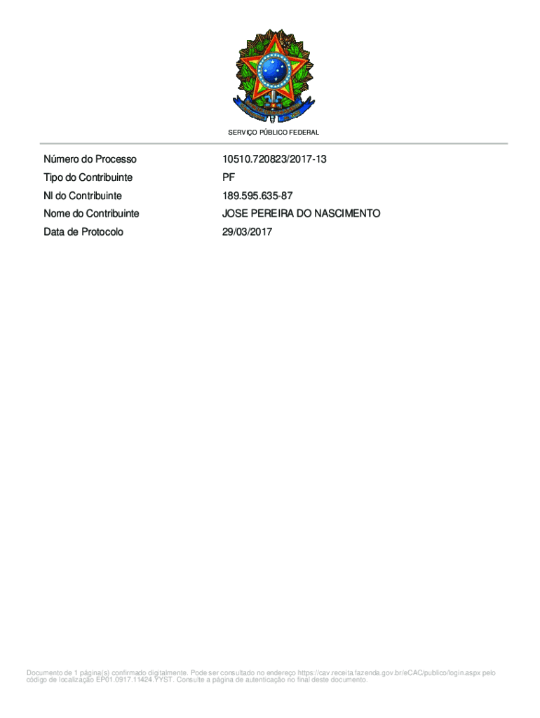 SERGIO PBL ICO FEDERALNmero do Processo10510.720823/201713Tipo do ContribuintePFNI do Contribuinte189.595.63587Nome do ContribuinteJOSE PEREIRA DO NASCIMENTOData de Protocolo29/03/2017Documento de