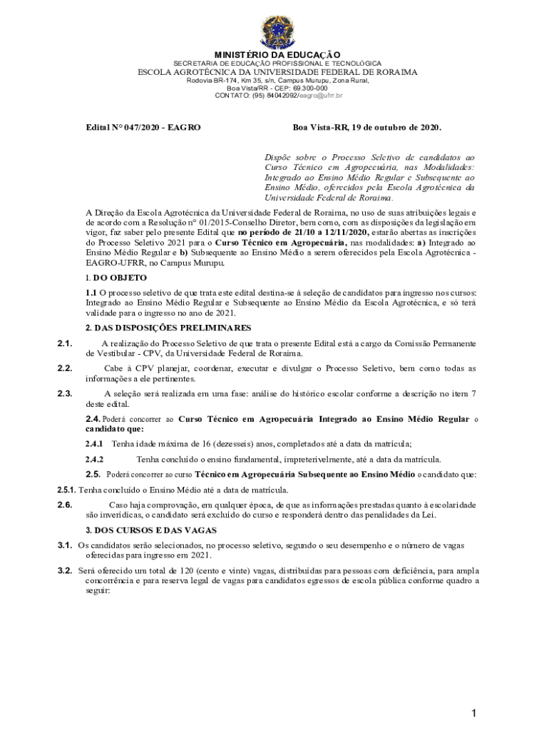 MINISTRY DA EDUCAOSECRETARIA DE EDUC AO PROFESSIONAL E TECNOLGICAESCOLA AGROTCNICA DA UNIVERSIDADE FEDERAL DE RORAIMA