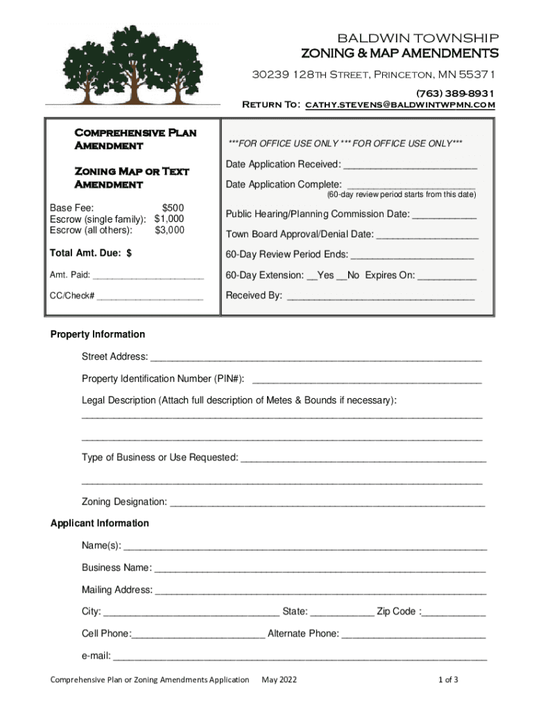 BALDWIN TOWNSHIP ZONING & MAP AMENDMENTS 30239 128th Street, Princeton, MN 55371 (763) 3898931 Return To: cathy.stevens@baldwintwpmn.comComprehensive Plan Amendment Zoning Map or Text Amendment***FOR