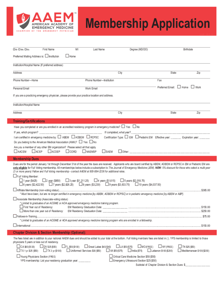 Membership Application AAEM1018191MrMrsFirst NameMsPreferred Mailing Address is:MIInstitutionLast Nondegree (MD/DO)BirthdateHomeInstitution/Hospital Name (If preferred address) AddressCityStateZip
