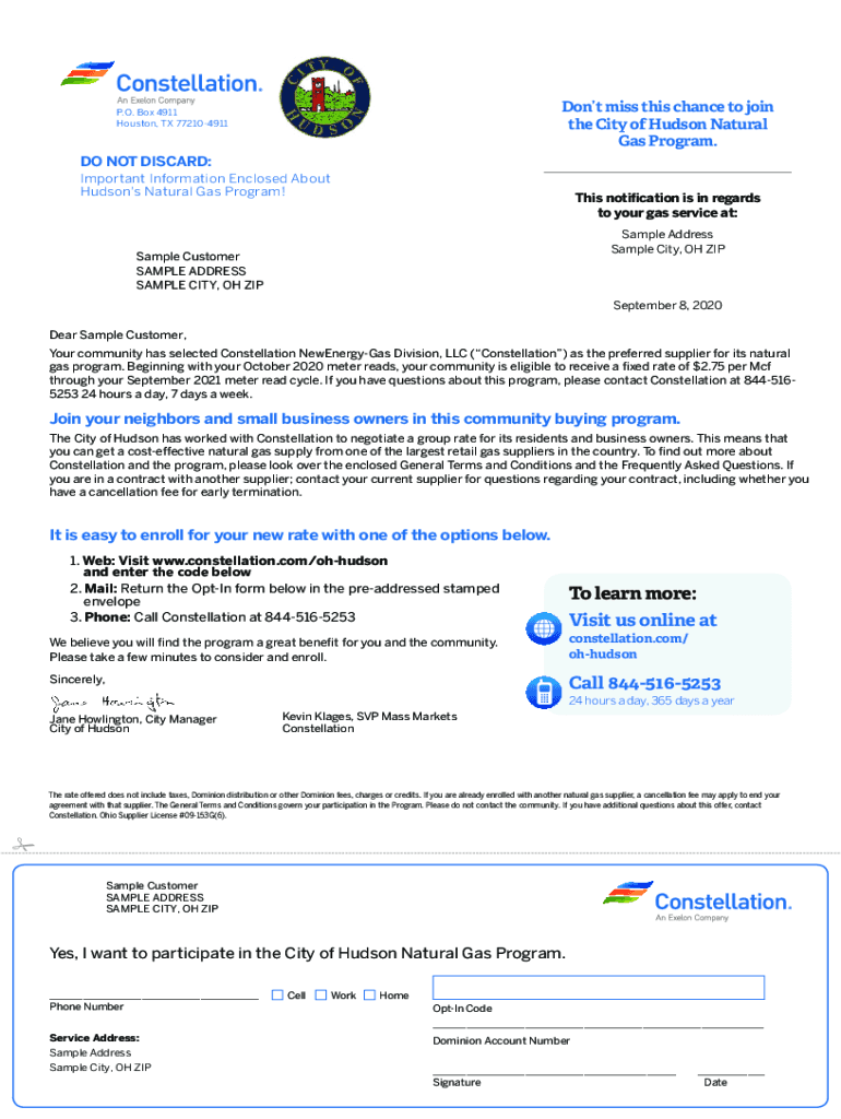 Don't miss this chance to join the City of Hudson Natural Gas Program. P.O. Box 4911 Houston, TX 772104911DO NOT DISCARD: Important Information Enclosed About Hudson\'s Natural Gas Program! This nomination
