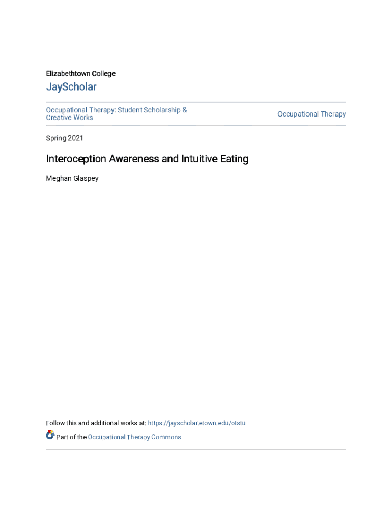 Elizabethtown CollegeJayScholar Occupational Therapy: Student Scholarship & Creative Works Spring 2021Interoception Awareness and Intuitive Eating Meghan GlaspeyFollow this and additional works at: