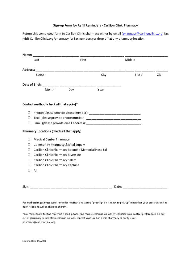 Sign up Form for Refill Reminders Carillon Clinic Pharmacy Return this completed form to Carillon Clinic pharmacy either by email (pharmacy@carilionclinic.org) fax (visit CarilionClinic.org/pharmacy