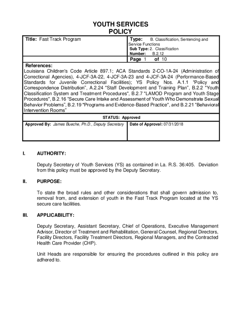 YOUTH SERVICES POLICY Title: Fast Track ProgramType: B. Classification, Sentencing and Service Functions Sub Type: 2. Classification Number: B.2.12 Page 1of 10References: Louisiana Children\'s Code