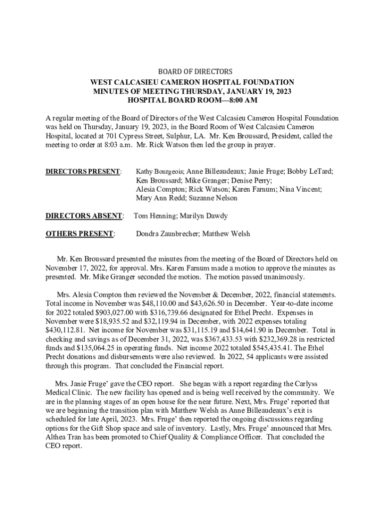 T BOARD OF DIRECTORIES CALCASIEU CAMERON HOSPITAL FOUNDATION MINUTES OF MEETING THURSDAY, JANUARY 19, 2023, HOSPITAL BOARD ROOM8:00 AM A regular meeting of the Board of Directors of the West Calcasieu