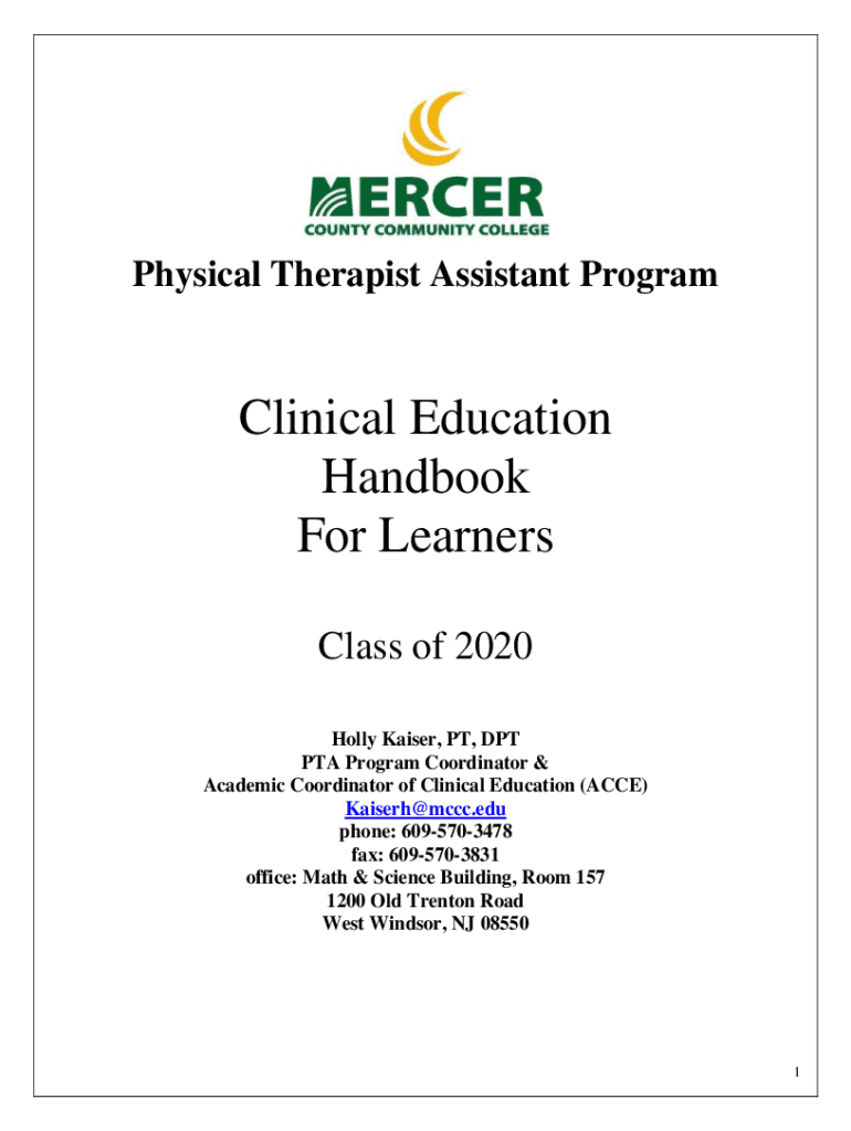 Physical Therapist Assistant ProgramClinical Education Handbook For Learners Class of 2020 Holly Kaiser, PT, DPT PTA Program Coordinator & Academic Coordinator of Clinical Education (ACRE) Kaiserh@mccc.edu