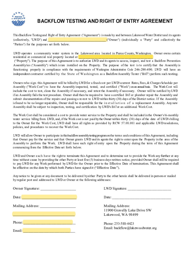BACKFLOW TESTING AND RIGHT OF ENTRY AGREEMENT This Backflow Testing and Right of Entry Agreement (\” Agreement\”) is made by and between Lakewood Water District and its agents (collectively, \”