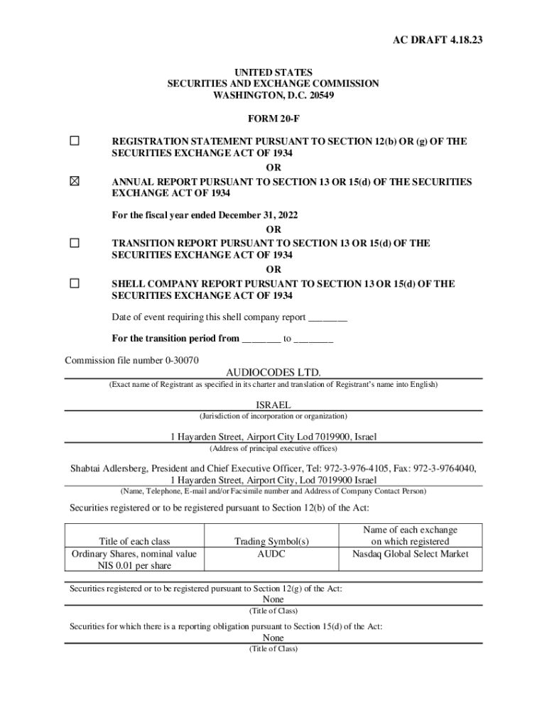 Audiocodes form 20-F is a form required by the U.S. Securities and Exchange Commission (SEC) for registration of securities in the U.S. by foreign private issuers.