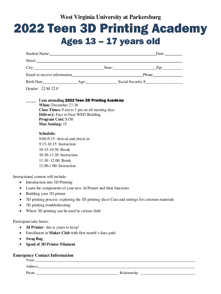 West Virginia University at Parkersburg2022 Teen 3D Printing Academy Ages 13 17 years old Student Name:Backstreet: City:State:Zip:Email to receive information Birth Telephone Age:Social Security #___Gender: