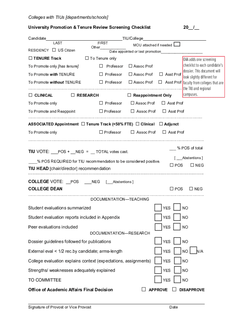 Colleges with Thus [departments/schools] University Promotion & Tenure Review Screening Checklist20__/__Candidate___TIE/College___ LASTRESIDENCY US Citizen TENURE Track Promote only [has tenure] To