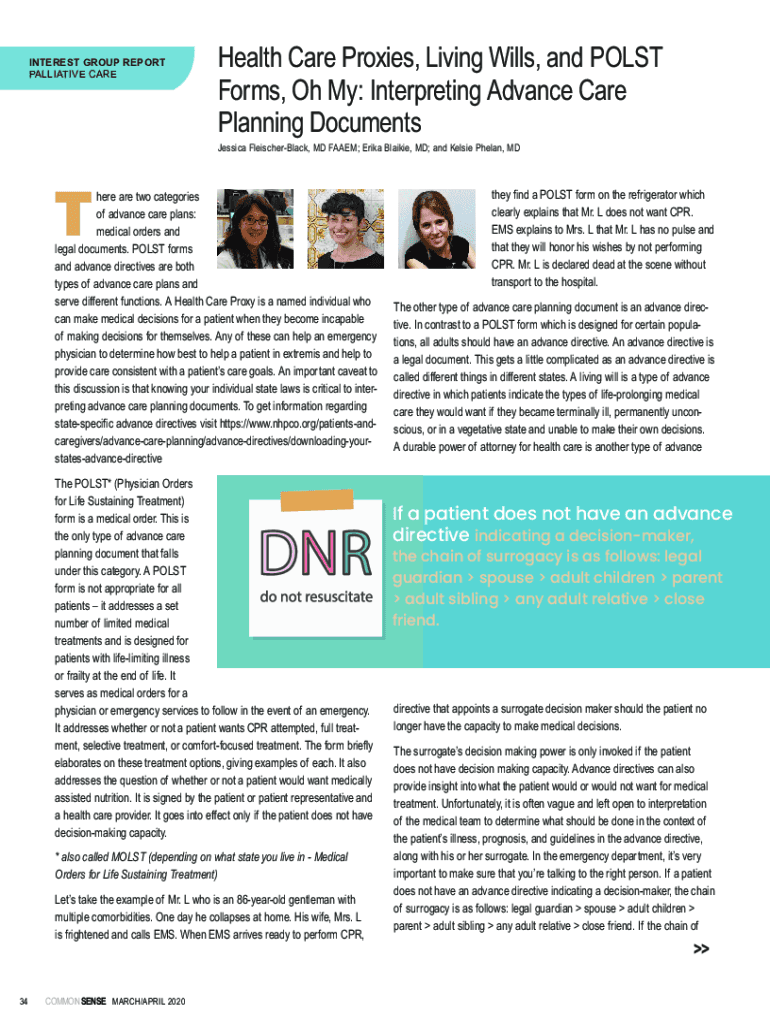 INTEREST GROUP REPORT PALLIATIVE Telehealth Care Proxies, Living Wills, and POST Forms, Oh My: Interpreting Advance Care Planning Documents Jessica FleischerBlack, MD FA AEM; Erika Blackie, MD; and