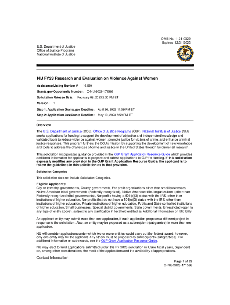OMB No.11210329 Expires 12/31/2023 U.S. Department of Justice Office of Justice Programs National Institute of Justice FY23 Research and Evaluation on Violence Against Women Assistance Listing Number