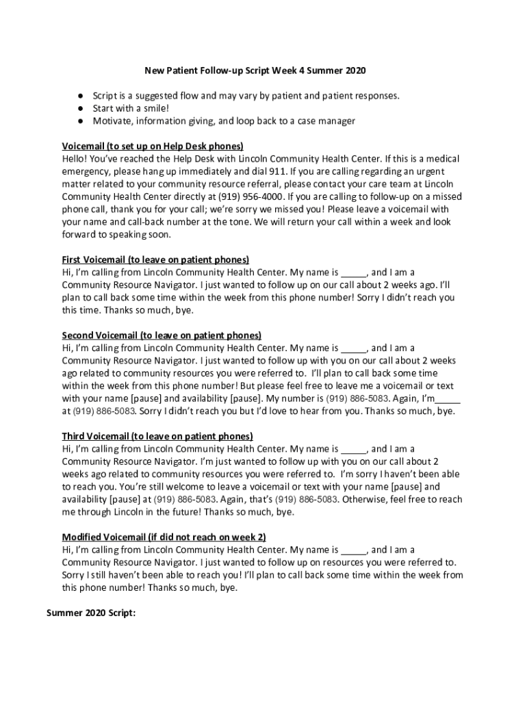 New Patient Followup Script Week 4 Summer 2020 Script is a suggested flow and may vary by patient and patient responses. Start with a smile! Motivate, information giving, and loop back to a case manager