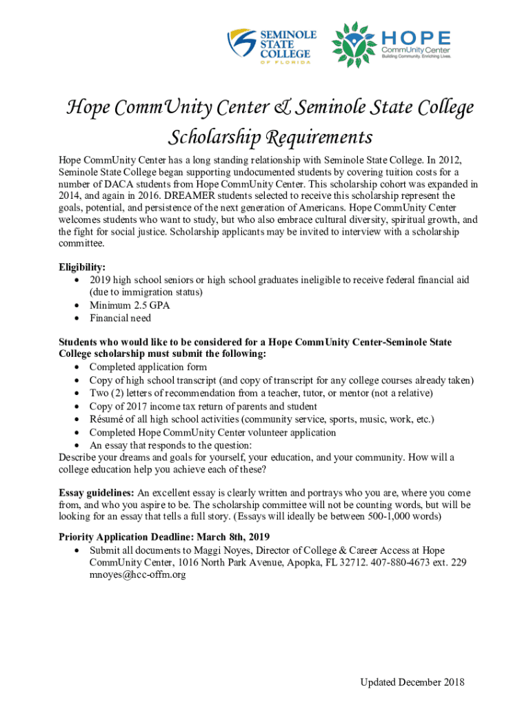 Hope Community Center & Seminole State College Scholarship Requirements Hope Community Center has a long-standing relationship with Seminole State College. In 2012, Seminole State College began supporting