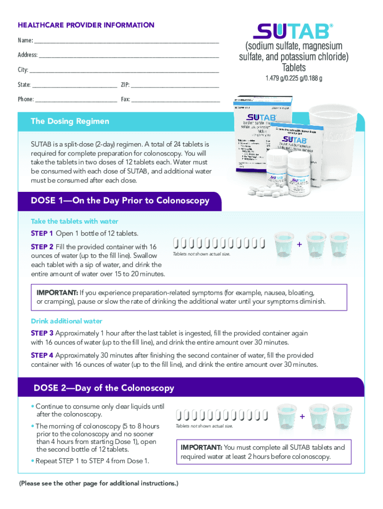 HEALTHCARE PROVIDER INFORMATION Name: ___ Address: ___ City: ___State: ___ZIP: ___ Phone: ___ Fax: ___The Dosing Regimental is a split dose (2day) regimen. A total of 24 tablets is required for complete